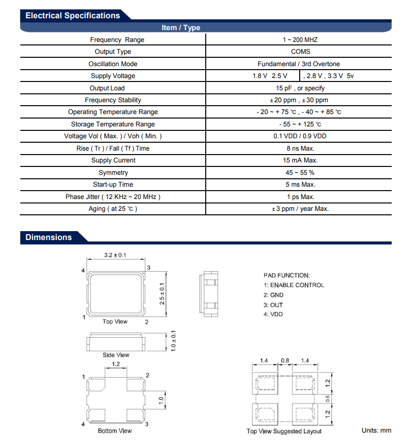 The active crystal oscillator 3225 is a compact SMD (Surface-Mount Device) sealed clock crystal oscillator unit, designed for WLAN, Bluetooth, DSC, DSL, and other IT applications.