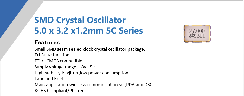 The active crystal oscillator 5032 is a compact SMD (Surface-Mount Device) clock crystal oscillator unit designed for joint sealing applications.The high precision characteristics cover a wide frequency range.
