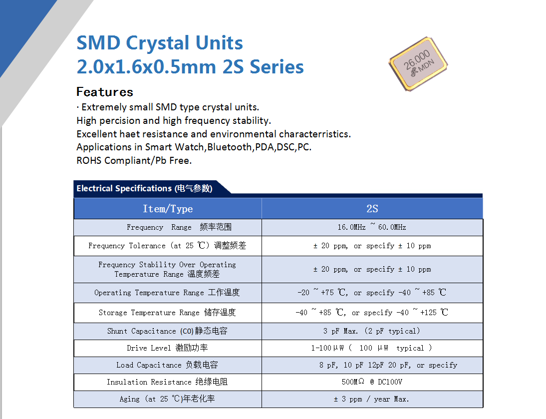 passive crystal oscillator chip 20S 16.0~60.0MHz 8~20PF ±20PPM