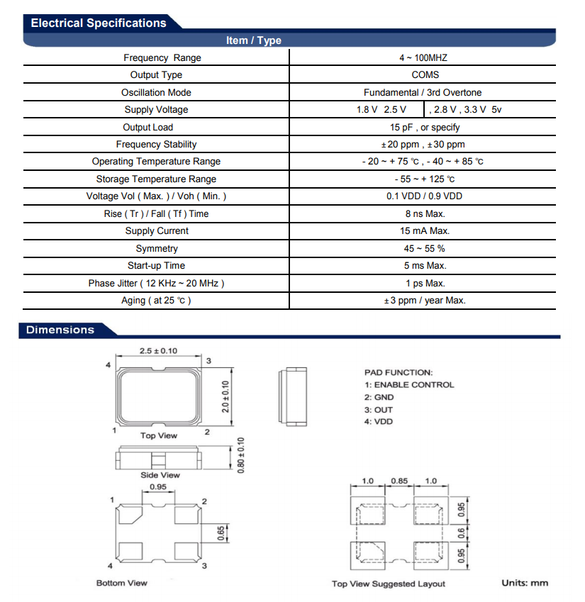 The active crystal oscillator 2520 is a compact surface-mount sealed clock crystal oscillator unit, designed for applications in WLAN, Bluetooth, DSC, DSL, and other IT products.